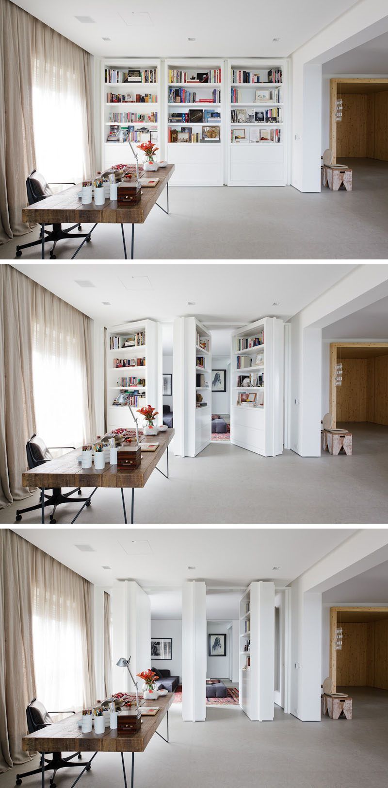 Si queremos añadir un plus a ambas habitaciones, como en este proyecto. Unas estanterías pivotantes nos crearán un espacio permeable o un espacio completamente encerrado según lo deseemos.