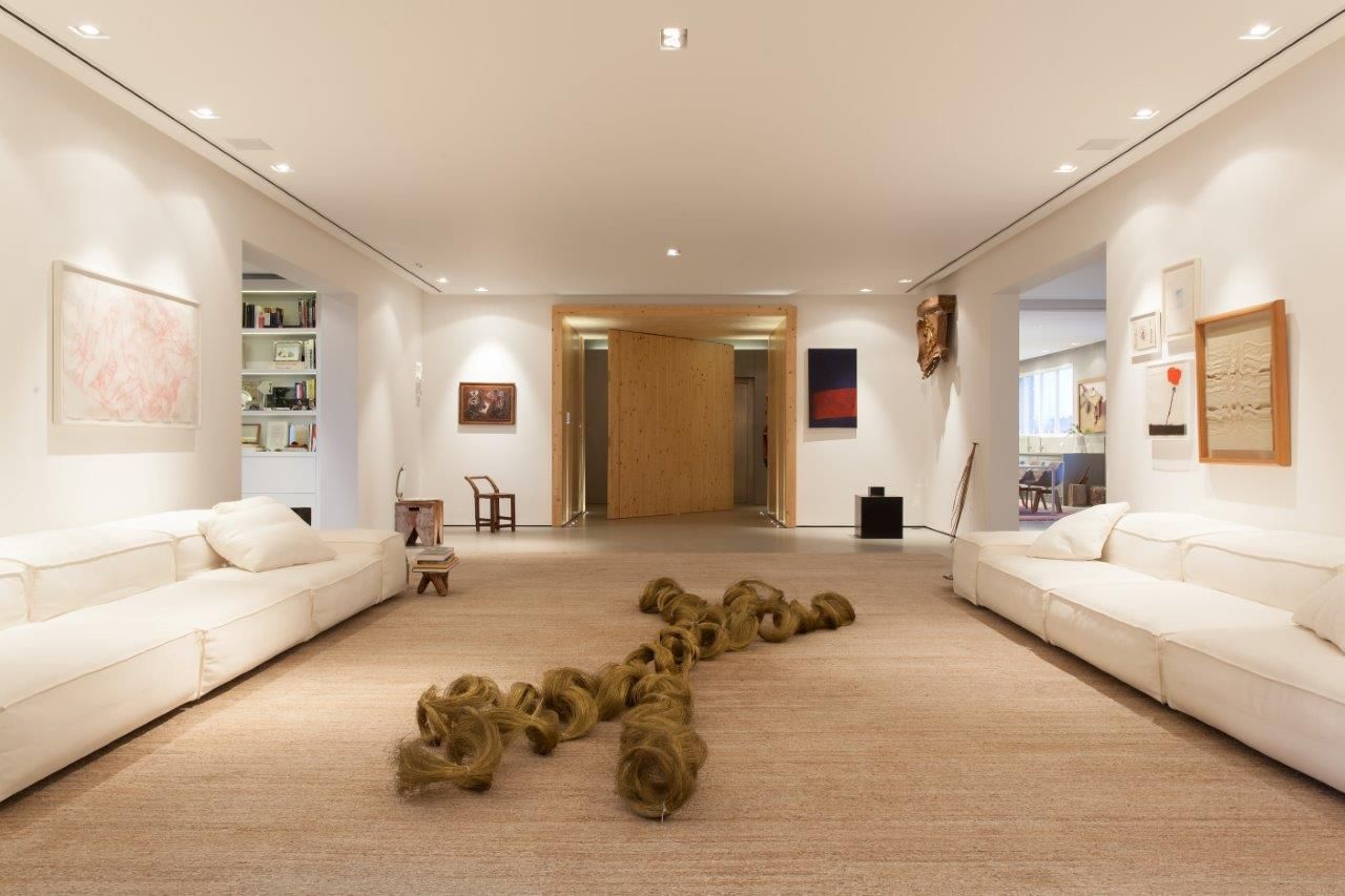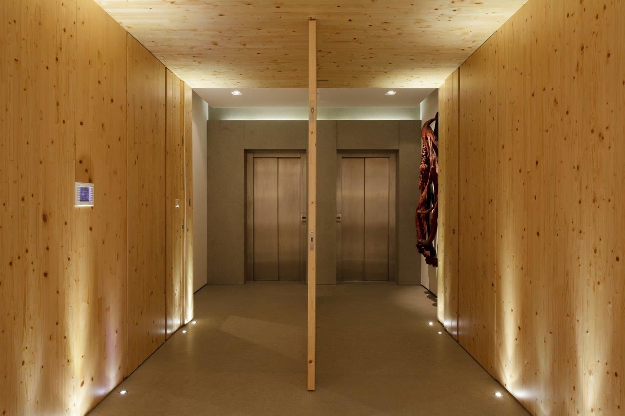 También se trata de un elemento pivotante que puede encerrar por completo el espacio o abrirlo y dejarlo completamente permeable a la sala de estar. Una curiosa combinación, abrir el espacio central de la vivienda al acceso principal, pero cada proyecto y cada cliente tiene sus caprichos.