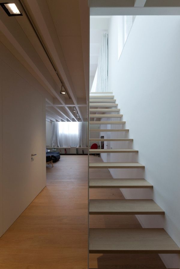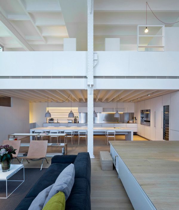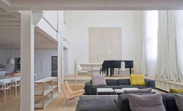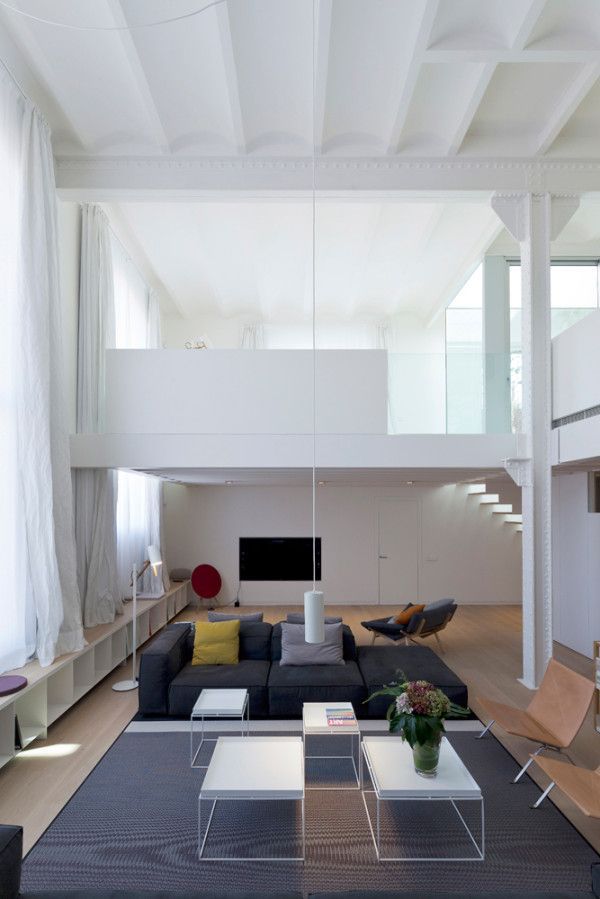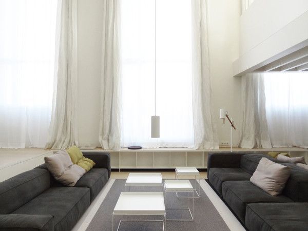 Los espacios son muy abiertos y fluyen de una habitación a otra. La sala de estar, con una doble altura y grandes ventanales que aportan una gran luminosidad. Gracias a unas cortinas blancas y el contraste con unos pocos elementos de decoración oscuros se crea un conjunto en armonía, que convierte el frío espacio industrial en una cálida sala dónde pasar las horas.