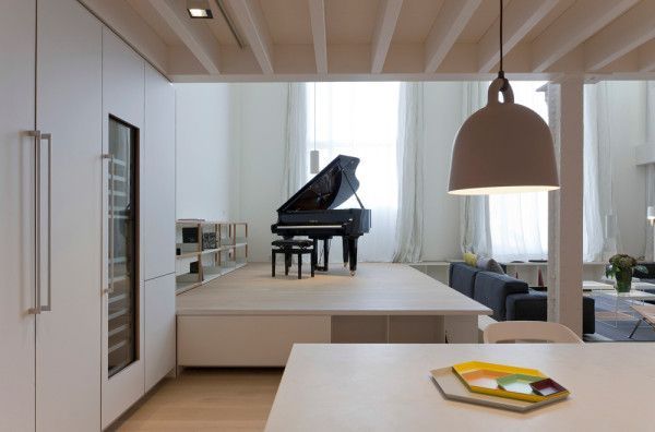 Una tarima de madera se añadió para dar un lugar imponente a un piano de cola negro. Este contrasta con todo el blanco de su alrededor. Esta tarima se se transforma a su vez en un lugar de asiento.