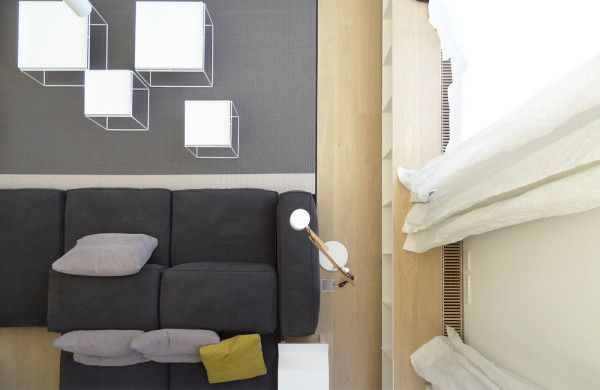 Esta parte del loft, donde encontramos el baño y zona de descanso, confluyen más el mobiliario de madera y las paredes blancas.