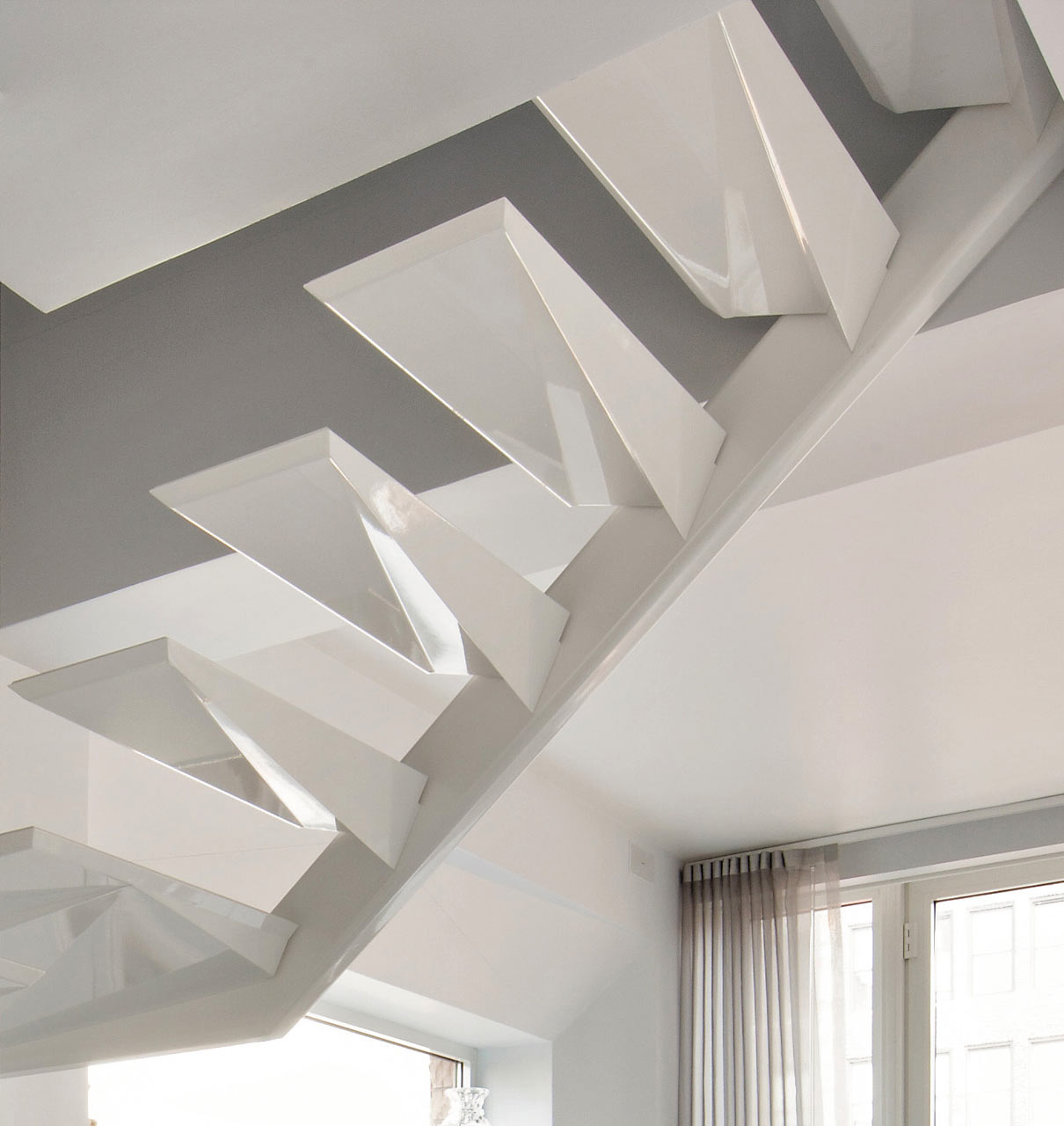 Los peldaños de la escalera en voladizo parecen flotar dentro del espacio. Un banco curvo de color blanco está colocado por debajo de la estructura.