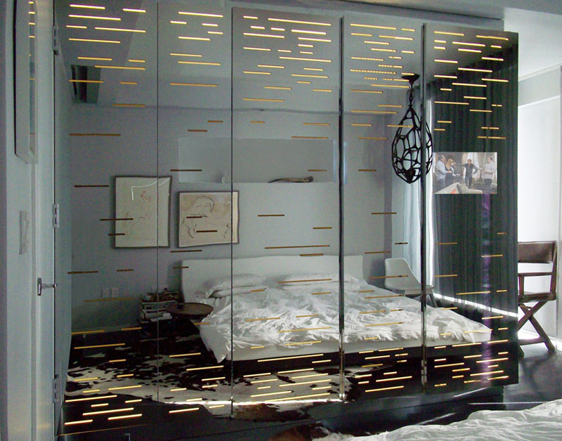 En una de las habitaciones se colocó una gran pared de espejo retro-iluminada que tiene el mismo patrón de líneas que la pared blanca de la planta baja. En esta misma pared se ocultó la pantalla del televisor.