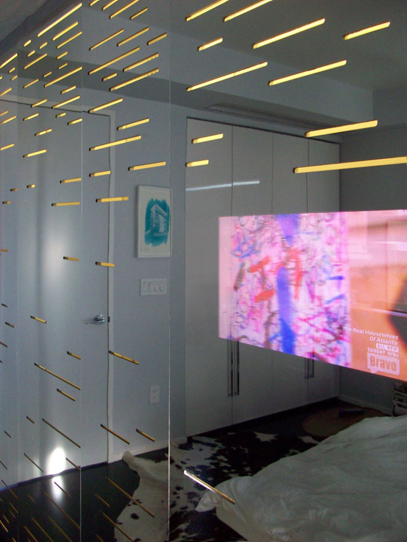 Para la fabricación de los paneles que recubren las paredes se utilizaron métodos de diseño y fabricación digital, como por ejemplo el fresado CNC que permiten la creación de una serie de planchas que imitan las luces del paisaje nocturno de Manhattan. Los paneles blancos están retro-iluminados con leds dando al apartamento un fondo muy interesante, casi de ensueño.